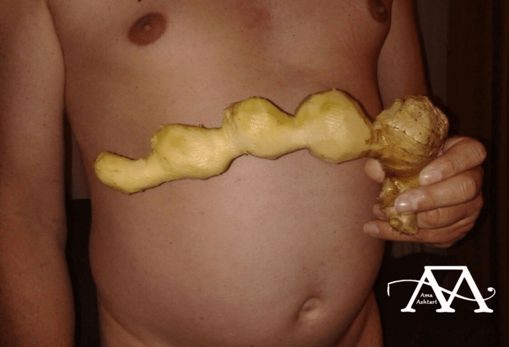 La segunda fase del juego con jengibre: patty haciendo el jugo que se va a tener que tragar…